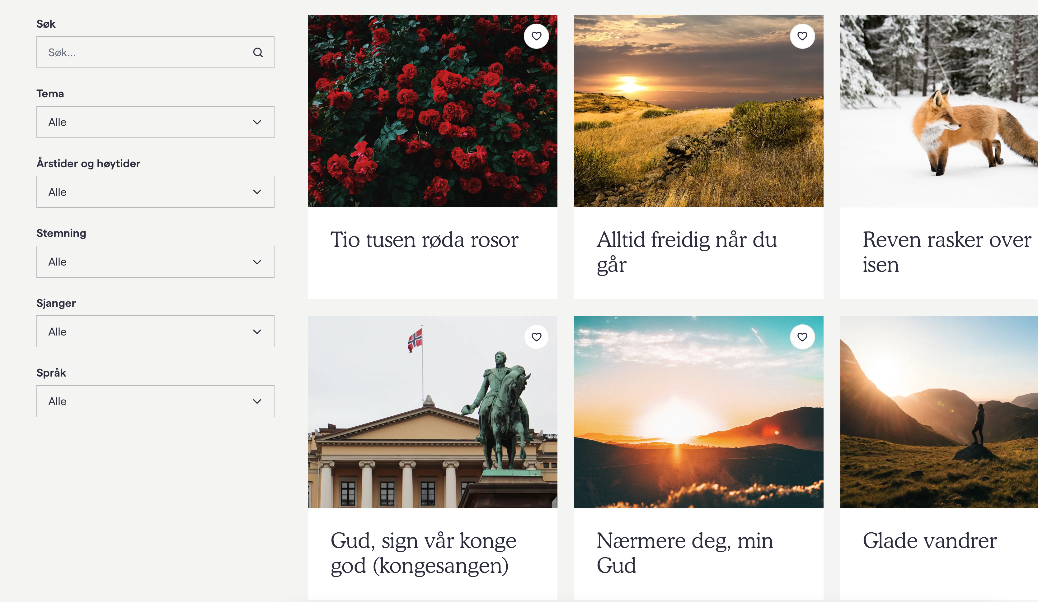 Sanger til hverdag, høytid og fest. Finn rett sang til rett anledning! Velg sanger ut ifra tema, sjanger, språk, årstid, osv.